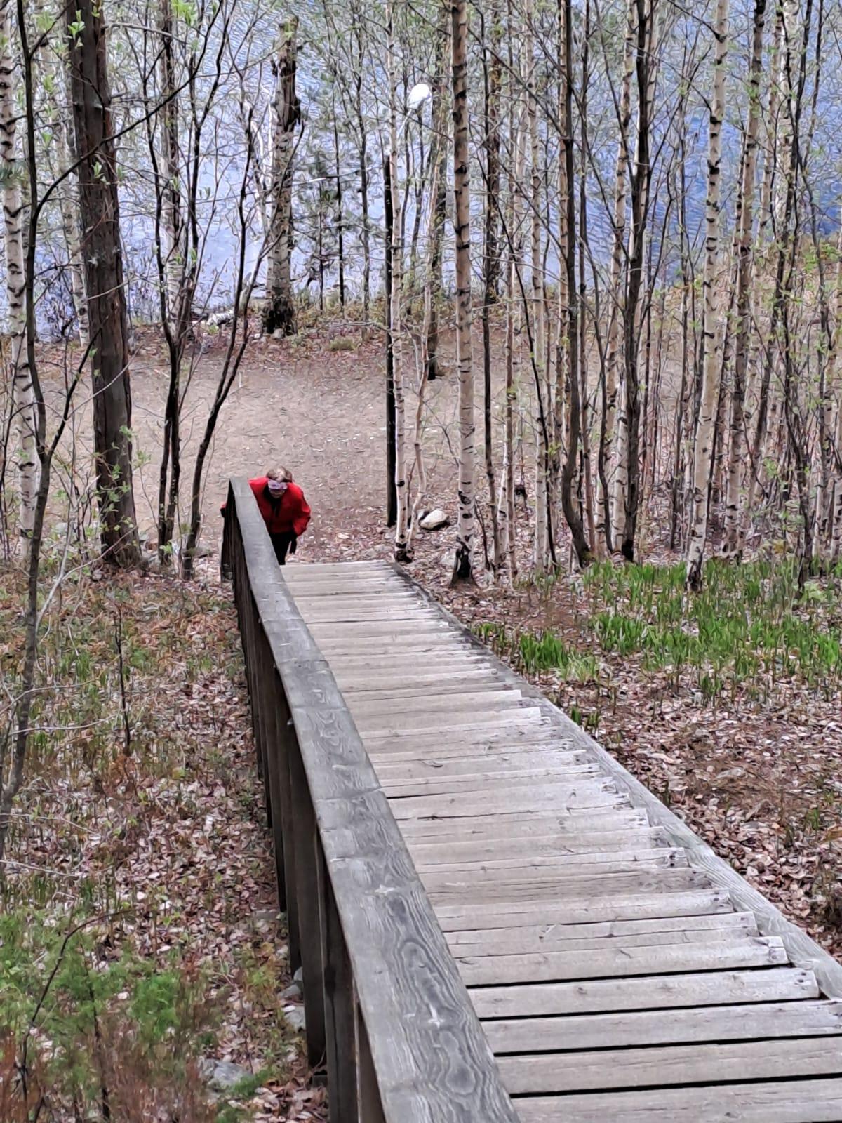 Sisarukset testasivat Lykynlammen portaat marttalenkillä.